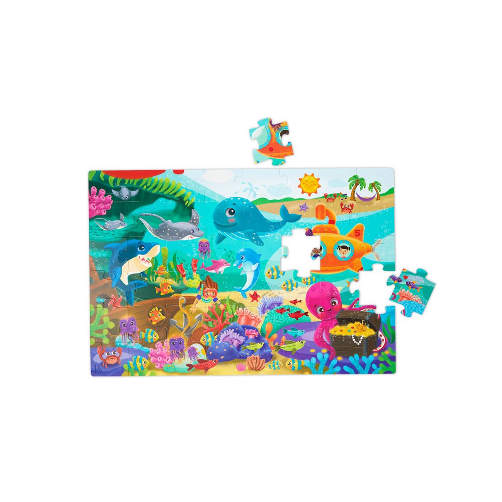 Pripravte sa na cestu do sveta pod morskou hladinou s maxi puzzle s krásnymi ilustráciami morského dna a jeho usmievavých obyvateľov! Extra veľké diely z pevného kartónu tvoria plochu 91,4 x 60,9 cm a sú tak ideálne na skladanie na podlahe.